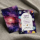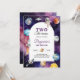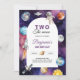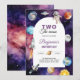 Convite divertido de festa de aniversário com tema espacial "Dois para a lua" com elementos de espaço em aquarela.
