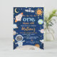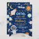 Blue Space First Trip Around Sun primeiro aniversario Invitation Cute outer space O convite para o primeiro aniversario do garoto com astronauta, planetas, espaçonave, satélite, sol e lua. A primeira viagem deste rapaz ao redor do primeiro convite de aniversário do sol é ideal para um tema de primeiro aniversário no espaço exterior.