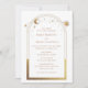 A Astronomia Espacial da Lua Solar Dourada Celestial White Star Astronomy Invisions apresenta sol, lua e estrelas com uma estrutura dourada sobre fundo branco. Dentro é a sua informação de convite de casamento. Personalize editando o texto nas caixas de texto. Projetado para você por ©Evco Studio www.zazzle.com/store/evcostudio