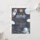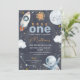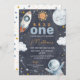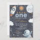 Espaço Escuro Primeira Viagem ao Redor do primeiro aniversario Sol Convite Espaço exterior doce ou primeira viagem ao redor do sol primeiro convite de aniversário para um bebê que apresenta um pequeno sol, planeta, estrelas, nave espacial e homem espacial sobre um fundo escuro. A primeira viagem deste rapaz ao redor do sol é ideal para uma primeira festa de aniversário espacial.