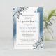 Elegante convite azul da Quinceañera em espanhol com mancha azul de aquarela como pano de fundo e belos buquês florais nos cantos superior e inferior, incluindo seus detalhes. Pintam-se as flores aquáticas e a folhagem em azul, azul marinho, azul real, azul real, branco e sábio. Enquadrar as informações do ouro. Utilização de caligrafia moderna e tipografia de blocos. O cartão está de volta com mancha azul de água. Coordenação de produtos disponíveis. O mesmo convite também está disponível em inglês. Parte do nosso casamento e da coleção de eventos "Rustic Blue Mountain".