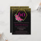 Celebre o 60º aniversário de uma mulher excepcional com este **Convite Elegante de 60º Aniversário em Espanhol em Preto, Dourado e Rosa**. Com um sofisticado fundo preto adornado com uma moldura dourada brilhante na parte superior, este convite emana classe e distinção. No centro, um hexágono dourado destaca belas peônias em aquarela em tons vibrantes de rosa forte e magenta, com o número "60" exibido de forma proeminente em rosa impactante. Os detalhes do evento estão elegantemente organizados em uma combinação de letras em bloco em rosa claro e forte, juntamente com caligrafia refinada, tudo totalmente personalizável para atender às suas preferências.