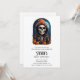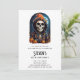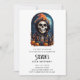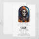 Convite de festa de aniversário com uma ilustração de um esqueleto vestindo um casaco com capuz e um chapéu de bruxa laranja em cima. Cercado por abóboras fofas e assustadoras. Uma lua brilhante ao fundo com um único morcego voando por perto. Diversão de outono no Halloween ou para presentes de temas de morte, festas ou negócios.
