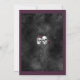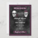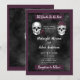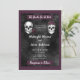 Convite de casamento sombrio e belo com a inscrição Até que a Morte Nos Separe, caveiras de esqueleto com rosas e um fundo preto sombrio sobre um fundo roxo. A parte de trás do convite tem caveiras juntas. Perfeito para um casamento gótico ou de Halloween.