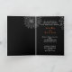 Casamento de Halloween com um casal de esqueletos vestido para o Halloween. A noiva usa um vestido laranja brilhante e tem abóboras no cabelo. O noivo usa um terno preto e cartola. Há grandes aranhas pretas e teias de aranha. Convite de casamento gótico que pode ser personalizado para atender às suas necessidades.
