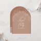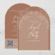 O convite de casamento mocha marrom estilo Arch é uma forma moderna e única de enviar convites para amigos e entes queridos. O convite apresenta um design floral. No verso do convite há um código QR para respostas, RSVPs e muito mais. Altere o texto e o endereço da Web de acordo com as suas necessidades. Use a modelo para personalizar.