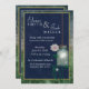 Garra de Mason de estilo country com luz branca brilhante pendurada sobre um fundo azul escuro. Flores brancas e cor-de-rosa acendem o design. Isto apresenta um olhar antiquado ainda é na moda para a noiva de hoje. Edite facilmente o convite para o seu casamento.
