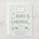 Um chá de fraldas verde, neutro, de moda, com uma armação pendurada com a mensagem "estamos estocando as prateleiras" acima de um trio de estantes de madeira empilhadas com colchetes cheios de berçários de bebês como uma planta suculenta potente, livros de bebês, brinquedos de madeira, um cadáver de fralda, cesta listrada, caixas empilhadas e uma garrafa de loção de bebês. Parte do Estoque das prateleiras coletadas por Stacey Meacham. Visite sua loja mais coordenando itens, assim como cores adicionais para um chá neutro em relação ao gênero ou para bebês.