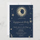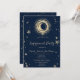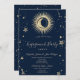 Sol e lua de ouro celestial e estrelas sobre fundo azul marinho. Belo convite que pode ser personalizado com seu nome. Selecione o botão "personalizar" para alterar o estilo, a cor e o tamanho da fonte.