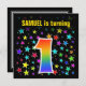 Este design vibrante, divertido e entusiasmante apresenta um padrão colorido de formas estelares, junto com o número "1", que apresenta um espectro multicolorido como o arco-íris ou um padrão de gradiente. O nome na frente pode ser personalizado. A parte traseira contém informações personalizadas sobre a parte. Convites de festas de aniversários como este podem ser enviados a potenciais participantes para uma festa de aniversário que se realiza para celebrar o primeiro aniversário de alguém. [~Z0000349]