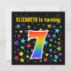 Este design divertido, excitante e vibrante apresenta um padrão colorido de estrelas, junto com o número "7", que possui um espectro multicolorido como o arco-íris ou padrão de gradiente. O nome na frente pode ser personalizado. A parte traseira apresenta detalhes personalizados sobre a festa. Convites de festas de aniversários como este podem ser enviados a potenciais participantes para uma festa de aniversário que se realiza para celebrar o sétimo aniversário de alguém. [~Z0000349]