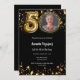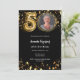 Um convite para fotos moderno e na moda para uma festa de aniversário 50ª. Um fundo preto clássico, decorado com estrelas douradas falsas. Personalize e adicione os detalhes da sua festa.