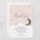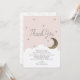 Este cartões de agradecimentos de menina fofo apresenta um fundo cor-de-rosa pincelado com estrelas falsas douradas, a lua crescente e nuvens brancas. O verso apresenta padrões de pontos aleatórios dourados falsos em fundo branco. Personalize para suas necessidades. Você pode encontrar mais produtos correspondentes na minha loja.