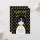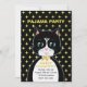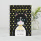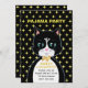 Cartão de Convite de aniversário do Pajama com um lindo gato de smoking como mensageiro e estrelas amarelas sobre fundo preto. Todo texto pronto para ser personalizado.