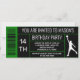 Convite de aniversário de basquete verde com jogador de basquete em um plano de fundo de etiqueta de calçado verde e preto. Basta adicionar os detalhes do evento.