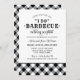 Um convite de celebração de recepção de casamento festivo e elegante para um evento casual de churrasco no quintal de verão. O texto inclui "Junte-se a nós para uma Recepção de Casamento de Churrasco 'Eu aceito'" em homenagem a um casal recém-casado. Cores clássicas de design preto e branco.
