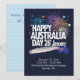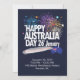 Cartão de Convite de Feriado Design Moderno. Coleção EU AMO AUSTrÁLIA. Letreiro "ALEGRIA! AMOR! PAZ!" e "Feliz Dia da Austrália 26 de Janeiro". Bandeira da Austrália, Mapa da Austrália, Coração, estrelas e fogos de artifício. Austrália Divertida, Cartaz Festivo Patriótico do Feriado Nacional para design de presentes e roupas. Convites e Papelaria > Convites e Anúncios. Decoração de Evento de Festival. Viagem, Viajando, Boa Viagem, Festa na Praia, Aniversário. Design com modelo de texto. Personalize-os adicionando nome ou texto de desejos. 2025