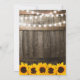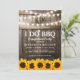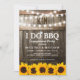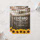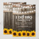 Convites rústicos de compromisso de casal "Eu faço churrasco" com fundo de barril de madeira de celeiro country, luzes cintilantes, girassóis amarelos dourados, aliança de casamento, seu monograma e um modelo de celebração de chá de casal que é fácil de personalizar.