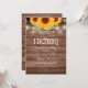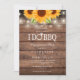 Lindas luzes de corda e girassóis decoram os detalhes da celebração da sua festa de noivado em tipografia elegante sobre um fundo de madeira rústica. O verso apresenta suas iniciais monogramadas dentro de um girassol correspondente. Projetado por Thisisnotme