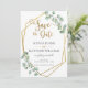 Este cartão chic de save the date de casamento apresenta uma moldura geométrica dourada adornada com bela folhagem de eucalipto em aquarela e tipografia de pincel em folha dourada. Projetado para combinar com nossa coleção de casamento Eucalipto Prata. Personalize-o com seus detalhes facilmente e rapidamente, basta pressionar o botão personalizar para reorganizar e formatar o estilo e a colocação do texto.