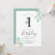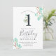 Um convite divertido e novo para primeiros aniversarios com nova aquarela de broto eucalipto em torno de suas informações exclusivas de aniversário. No verso está uma cor vibrante para complementar a frente.