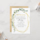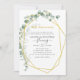 Convite de aniversário de casamento de 50 anos com eucalipto geométrico moderno e folhagem verde com moldura geométrica dourada e verso com lavagem de aquarela dourada.