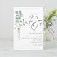 Casamento com Código QR de Eucalipto Moderno. Adicione o seu código QR ao site do seu casamento no verso, o que torna esta uma opção conveniente para os seus convidados responderem e verem todos os detalhes sem a necessidade de cartões separados de RSVP e detalhes. Estilo botânico minimalista, com um conjunto de letras manuscritas para "Nós nos casamos" e o resto do texto que você pode personalizar facilmente. Um ramo elegante de folhas de eucalipto em aquarela desce pelo lado esquerdo.