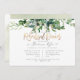 Flores aquarelas goma azul rústica e arranjo verde com lindos tons escuros de folhagem Eucalipto. Acentuado com o elegante e moderno falso roteiro escrito manual do Janto de ensaio Convites. Aquarela no lado invertido com cor de fundo DIY.