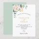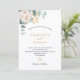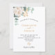 Um fundo branco chic. Decorados com uma flor branca, uma flor (pénia) e folhas verdes de eucalipto de cor aquosa, prigos, verde e um purga dourado. Personalize e adicione seus nomes e detalhes do casamento. Letras pretas e ouros. Verso: cor verde do fundo.