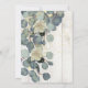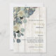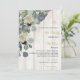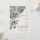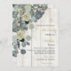 Um simples ramo de folhas de eucalipto com flores e sotaques dourados sobre um fundo de madeira rústica. Convite personalizado para casamento elegante e na moda. Altere facilmente as informações para o seu próprio design personalizado.