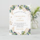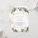 Um fundo branco decorado com verde de eucalipto e folhas de ouro e gotas falsas de ouro. Personalize e adicione seus nomes e detalhes do casamento. Letras pretas e ouros coloridas. Traseira: fundo branco com quedas de brilho de falso ouro