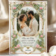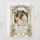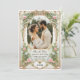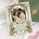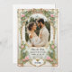 Apresente seus amigos e família aos primeiros vislumbres de seu dia especial com este convite de cartão salva-vidas elegante e exclusivo. Este design foi criado especificamente para mostrar uma foto valiosa de você e seu parceiro de vida enquanto apresentava detalhes dourados junto com florais cor-de-rosa e eucalipto verde. É perfeito para qualquer tema de casamento romântico, jardim, vintage e eterno, pois oferece uma estética vintage, mas moderna, que irá lindamente complementar seu momento especial.