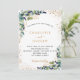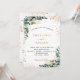 Um fundo branco decorado com verde de eucalipto e folhagem de ouro. Personalize e adicione seus nomes e detalhes do casamento. Letras pretas e ouros coloridas. Voltar: adicione seu weburl ao seu site de casamento para RSVP ou detalhes.