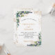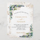 Um fundo branco decorado com verde de eucalipto e folhagem de ouro. Personalize e adicione seus nomes e detalhes do casamento. Letras pretas e ouros coloridas. Voltar: adicione seu weburl ao seu site de casamento para RSVP ou detalhes.