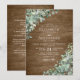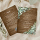 Buquês de aquarela eucalipto verde decoram este casamento rústico de madeira em um único convite, com o texto em fontes elegantes modernas, e fundo de madeira rústica. No verso estão os detalhes do casamento com o código QR e o site.