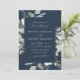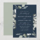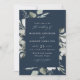 Convites de casamento Elegantes de eucalipto com seus detalhes enquadrados por uma fronteira de eucalipto e folhagem em tons de verde claro e escuro com um fundo azul marinho. Os convites de casamento de eucalipto com aquarela invertem para exibir um plano de fundo verde de sábio sólido.