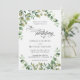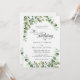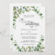Belo convite de casamento de eucalipto com tipografia de roteiro. Folhas impermeáveis pintadas à mão em verdes pastéis macios. Edite facilmente a modelo com os detalhes do seu casamento. Convite Eucalyptus Elegante.
