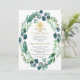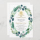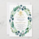 Design de cartão elegante com uma corante aquosa verde de eucalipto foliage, uma falsa camada de ouro, cruz e estrutura dourada, divisor floral, sobre fundo branco. Na parte de trás, buquê de flores brancas, cálice de ouro e iniciais. Use a ferramenta Personalizar para adicionar suas informações, alterar fontes, cores da fonte. Para encontrar itens, por favor, visite minha Santa Coleção de Comunhão.