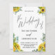 A distinção desta suíte deve-se à fonte moderna e casual de escrita manual usada para frases de sotaque. Nesta peça, esta simples fonte foi usada para criar gráficos que liam "O Casamento de" e "e". Os cantos são embelezados por imagens que retratam buquês de girassóis e de eucaliptos. Use os campos modelo para adicionar seus detalhes pessoais. Por favor, responda a quaisquer solicitações especiais ou personalize a assistência. 151 //