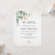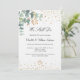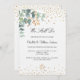 Um fundo branco chic. Decorados com folhas de eucalipto, prigos, verde e dourado, de cor aquosa verde. Ouro corações borrifam. Personalize e adicione seus nomes e detalhes da cerimônia. Letras negras. Volta: ouros.