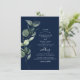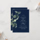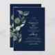Eucalyptus Greenery Foliage Watercolor design for your Spring Wedding Invitations on navy blue background featuring a modern and elegant script typography.