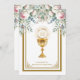 Celebrar o Sacramento da Primeira Comunhão é uma ocasião maravilhosa. Este tradicional vintage, feito por hábitos católicos, floral da Primeira Comunhão, Convite com um Chalice de ouro, Santo Eucarista e design floral cor-de-rosa é certamente a expressão da beleza e solenidade deste dia especial. Todo texto e fontes podem ser modificados facilmente.