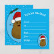Adorável batata de desenho animado marrom engraçada fofa feliz vestindo um chapéu de Papai Noel vermelho e branco. A batata está em um estilo de arte de desenho animado e colorida de marrom, ele tem braços e dedos de palito e um grande sorriso feliz com pontos para os olhos. O chapéu de Papai Noel em sua cabeça é vermelho com uma faixa branca e um pompom branco pendurado. Ele está dentro de uma forma oval azul clara com uma moldura azul escura e duas folhas de azevinho verdes com duas frutas vermelhas no topo do oval. A cor do fundo é um azul claro brilhante com flocos de neve brancos flutuando para dar um clima festivo a esses convites sazonais fofos.