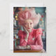 Um retrato espantoso de uma idosa elegante, com um estilo de cabelo rosado extravagante e um traje de convivência, exuberando confiança e charme. Sua composição vibrante e seus acessórios detalhados, incluindo broches em forma de coração, evocam temas de amor e paixão. Com um sutil festeiro de seus lábios, ela parece soprar um beijo delicado, adicionando um toque de romance ao confortável fundo do café.