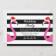 Dois flamingos cor-de-rosa giros vestindo chapéus de Papai Noel em um fundo listrado preto e branco, decorando este convite divertido para festas de férias. Outros elementos de coordenação podem ser encontrados na Fa la la Flamingo Holiday Collection.