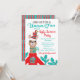 Llama divertiu convites de festas de suéter de Natal Feio com um Llama vestido para o feriado com um chapéu de santa brega com fitas e arcos em volta de seu pescoço longo e um suéter feio, cercado por cacto. Coincide com este! Excelente para qualquer idade! Ilustração desenhada à mão por McBooboos