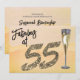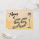 Este convite de aniversário "Fabulosa aos 55" apresenta uma fotografia de uma taça de champanhe na frente e detalhes da festa no verso sobre um fundo de aquarela pastel. Preencha os campos de texto do modelo com suas informações, remova o texto ou edite usando a ferramenta de design para selecionar um estilo de fonte, tamanho e cor de sua preferência.