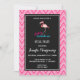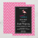 Um convite para chá de noiva com uma ilustração gráfica de um flamingo rosa. O texto diz: Fabuloso Rebanho. O padrão de fundo é um padrão de chevron desenhado à mão rosa e branco.