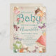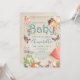 Esse convite de chá de fraldas, caprichoso e encantador, apresenta um tema de campo de fadas em um design de pintura a aquarela. Duas fadas bonitinhas são filmadas fluindo perto do topo do convite. As lixeiras, um sapo, cogumelos e folhagem da floresta, soam as fronteiras. A palavra "Bebê" é acentuada com a folhagem das terras arborizadas a aquarelas. Vários pequenos cogumelos e flores cor-de-rosa são colocados ao longo do fundo da letra.