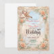 Transporte seus convidados para uma era romântica com este design etéreo apresentando um querubim vintage e pastéis suaves. Perfeito para uma celebração elegante de primavera. Este design apresenta uma composição sofisticada que lembra a arte do século XVIII. Uma moldura ornamentada impressa que imita o visual de mármore bege e a moldura de relevo arquitetônico emoldura o layout. Dentro da moldura, um fundo azul poeirento estabelece um tom celestial, sobreposto por uma ilustração vintage de um anjo querubim tocando violino. A cena é acentuada por rosas cor de damasco suaves, margaridas brancas e folhagem verde-sage. O texto é apresentado em uma fonte formal e elegante. Esta é uma imagem impressa plana com efeito de textura de pedra falsa, não material real elevado ou relevo 3D.